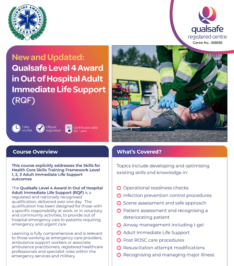 Launched in January 2024, Qualsafe Level 4 Award in Out of Hospital Adult Immediate Life Support (RQF) replaces the withdrawn